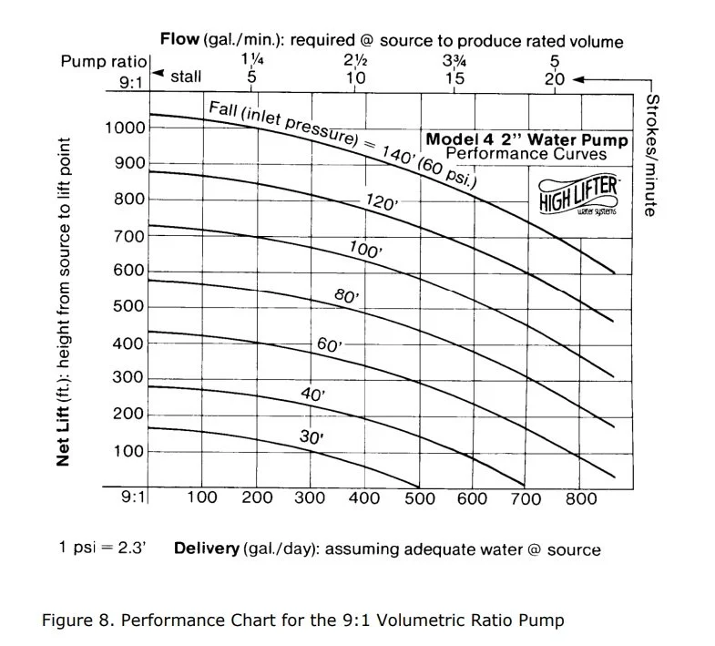 Although sometimes the 9:1 model is best for lifts lower than 427 feet if the available fall is very limited, such as when your water source is close to the valley floor or a property boundary.
