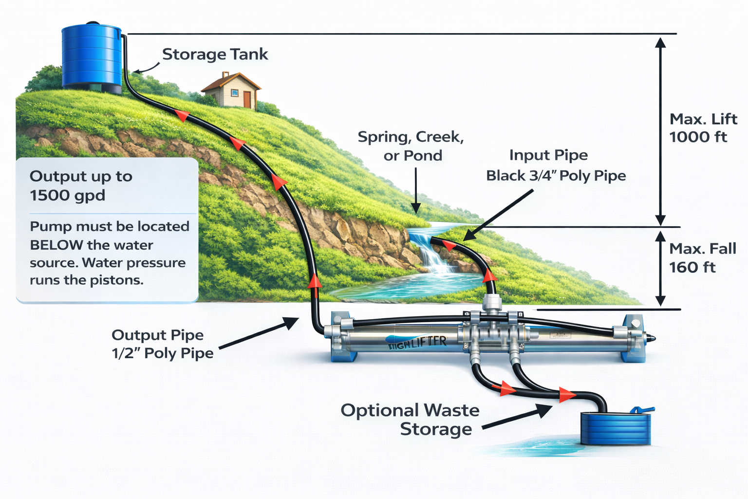 On our property for instance we run two Highliter 9:1 model pumps to lift water through 1800 feet of pipe up 520 feet in elevation. With an input pressure of about 30 psi our Highlfters develop 225 psi output pressure and deliver 750 gallons of water per day to the tanks at the top of the property. We gravity feed this water to our home, livestock and garden.